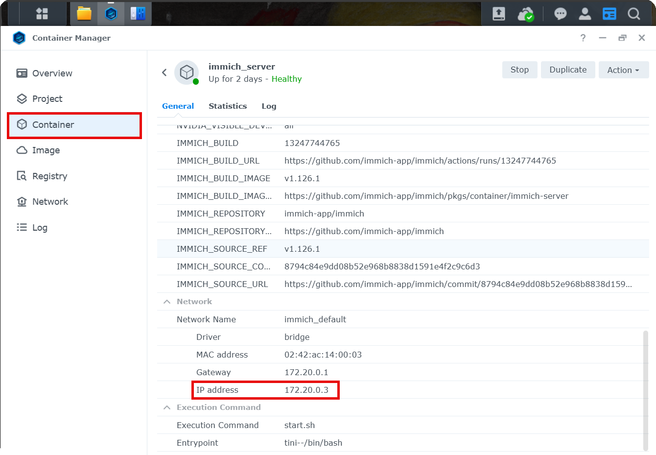 Once your containers are successfully running, navigate to the "Container" section of Container Manager, right-click on the "immich-server" container, and choose the "Details".