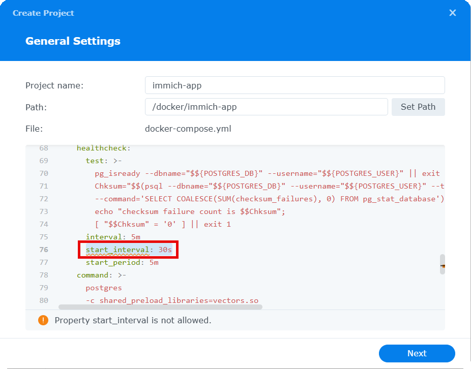 The following screen will give you the option to further customize your docker-compose.yml file, giving you a warning regarding the start_interval property. Under the healthcheck heading, remove the start_interval: 30s completely and click "Next".