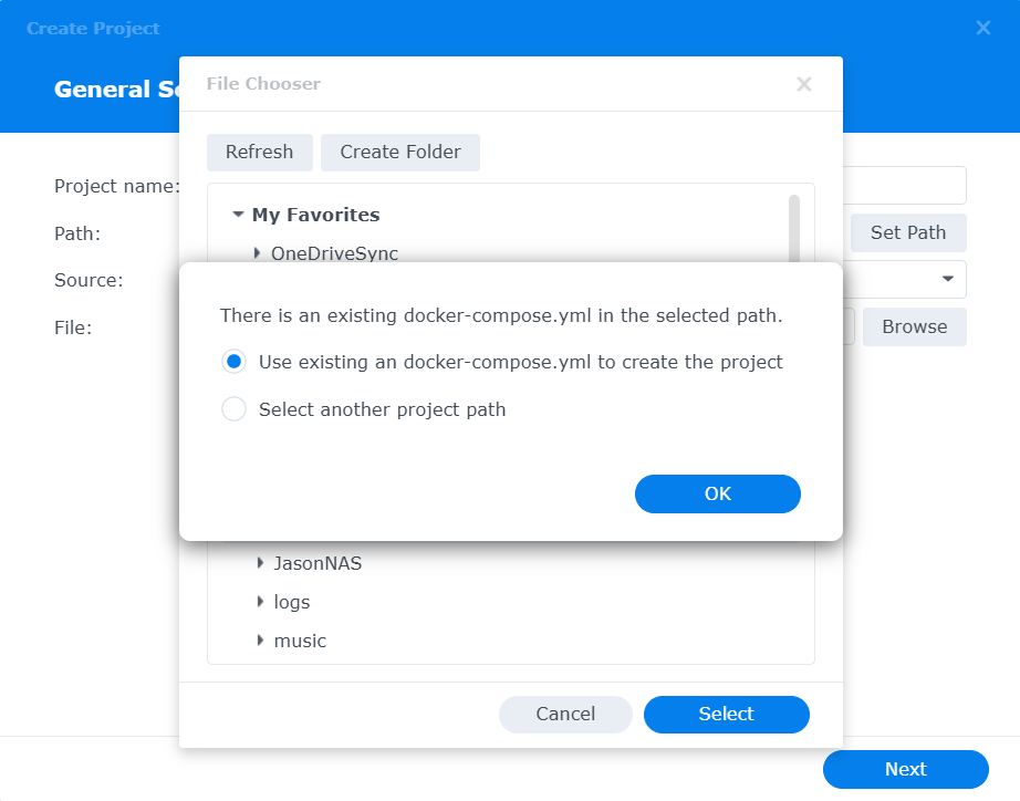 In the settings of your new project, set "Project name" to a name you'll remember, such as immich-app. When setting the "Path", select the ./docker/immich-app directory you created earlier. Doing so will prompt a message to use the existing docker-compose.yml already present in the directory for your project. Click "OK" to continue.